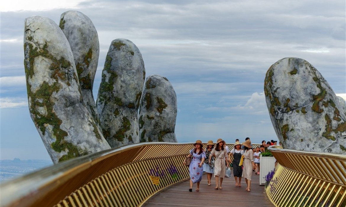 Quý khách sẽ được tham quan trải nghiệm cảm giác giống như băng qua thiên đường tại CẦU VÀNG trên mây - nằm ở độ cao 1,400m so với mực nước biển, cây cầu xuất hiện như 1 dải ruy băng vàng được nắm giữ bởi hai bàn tay khổng lồ nỗi lên từ sườn đồi.